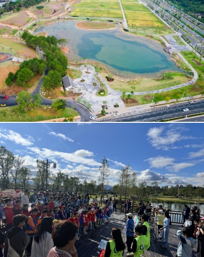 龍州濕地是九龍江流域山水林田湖草沙一體化保護和修復項目海綿城市建設范例工程,也是我市2023年十大重點攻堅項目北部新城建設的“點睛之筆”,主要使用的是國家政策補助資金。項目占地面積約20公頃,通過“護山、理水、營林、興田、清湖、豐草”六大舉措,構建了蓄洪湖區(qū)、生態(tài)修復區(qū)、農(nóng)田區(qū)及休閑區(qū)多樣用地,同時,設置了蓄洪湖、濕地步道、山谷攔蓄、引水工程等海綿設施,實現(xiàn)“城在田中田在城中”山水田園與城市和諧共生的美好景象。