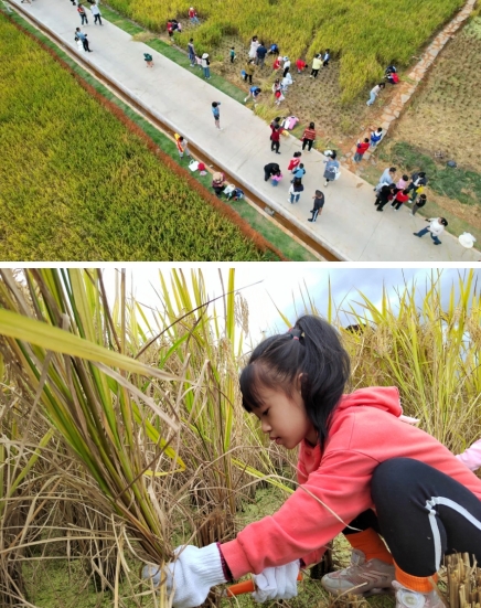 11月12日,市政集團建設的龍州濕地水稻田迎來了豐收季,藍天白云倒影在清澈見底的湖面,伴隨著五彩繽紛的波斯菊花海搖曳生姿,金黃色的稻谷在秋風中散發(fā)著陣陣稻香...城市的繁華與美不勝收的風景和諧共生的畫面,吸引了來自龍巖中心城區(qū)中小學生、家長及眾多市民前來參觀、體驗。學生們利用假期走進田間課堂,真切體會了龍巖“新晉網(wǎng)紅打卡地”的獨特魅力。