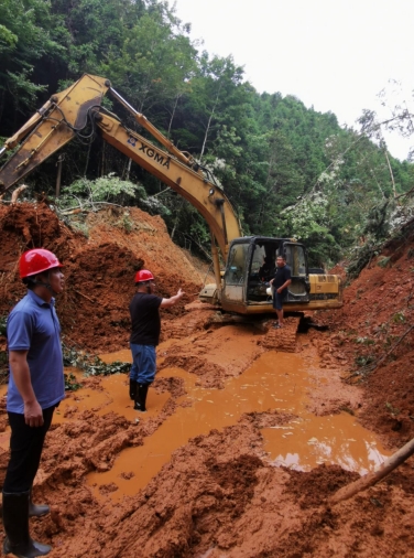 對搶險人員來說,最困難的不是清淤,而是5臺挖掘機、4臺拖車的加油問題,由于道路還未暢通,機械無法到達指定場所加油,當地又無加油車,如果無法加油,機械很快就將停工,救援人員已經做好一桶一桶“手動”拎汽油的準備。為解決加油問題,市政集團黨員代表與巖前鎮(zhèn)政府多次溝通,共同協調從廣東廣福鎮(zhèn)安排加油車到達受災點為機械進行加油,解決了現場機械供能問題。